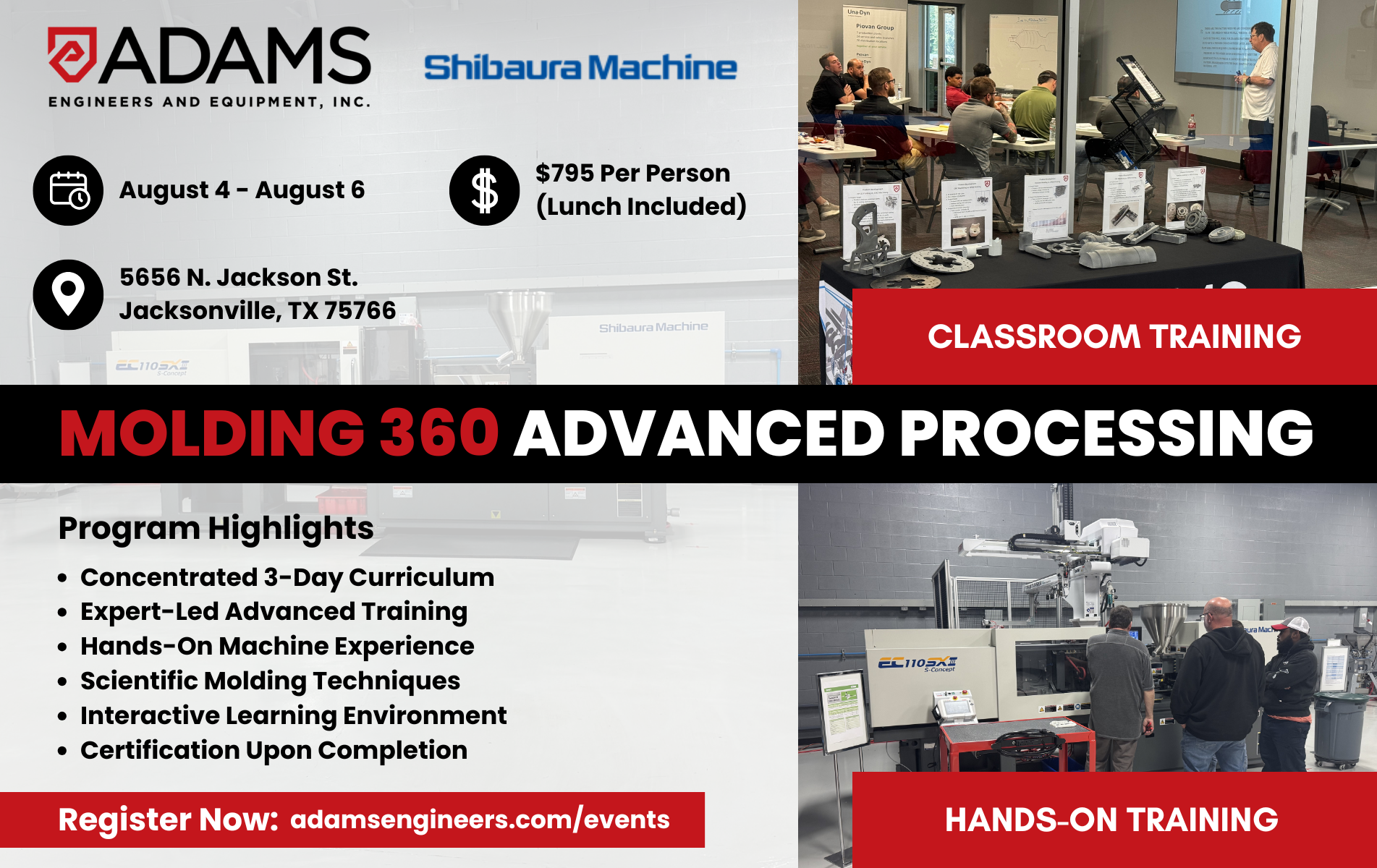 Hosted by Adams Engineers and Equipment, Inc. in collaboration with Shibaura Machine, this course is ideal for processors, engineers, and technicians looking to sharpen their skills and stay competitive in today’s molding market.