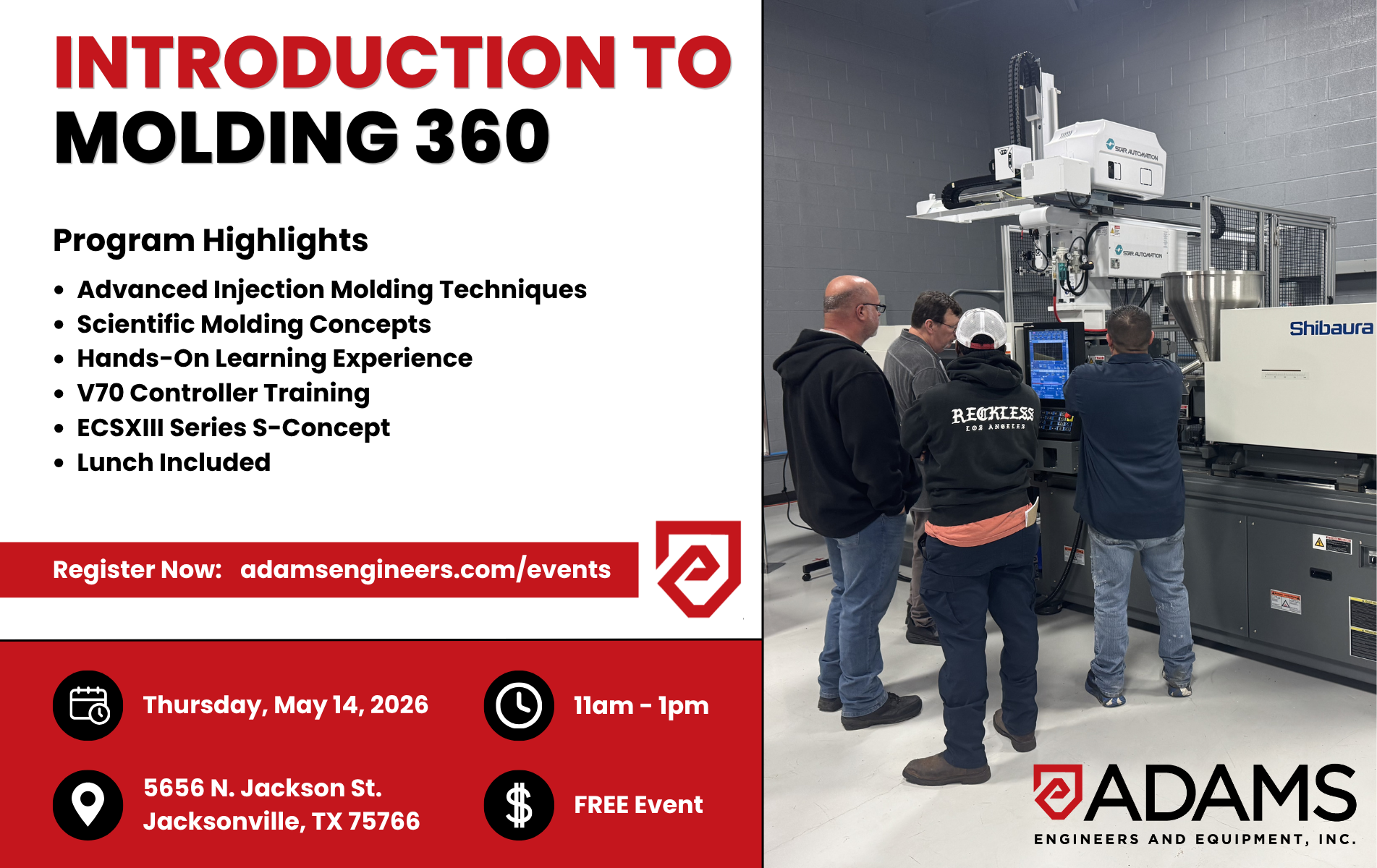 Adams Engineers and Shibaura Machine invite you to a lunch and learn at our Technical Training Center in Jacksonville, Texas. This course covers the core principles of scientific molding and shows how to apply them.