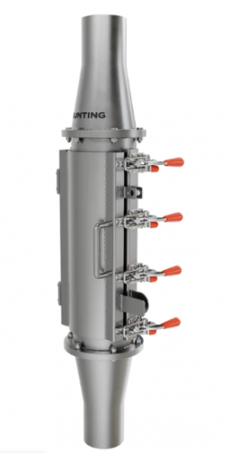 Removes fine ferrous particles from pneumatically conveyed granular or pelletized materials. Its tapered, aerodynamic design maintains flow velocity while maximizing contact with a high-strength magnetic cartridge.